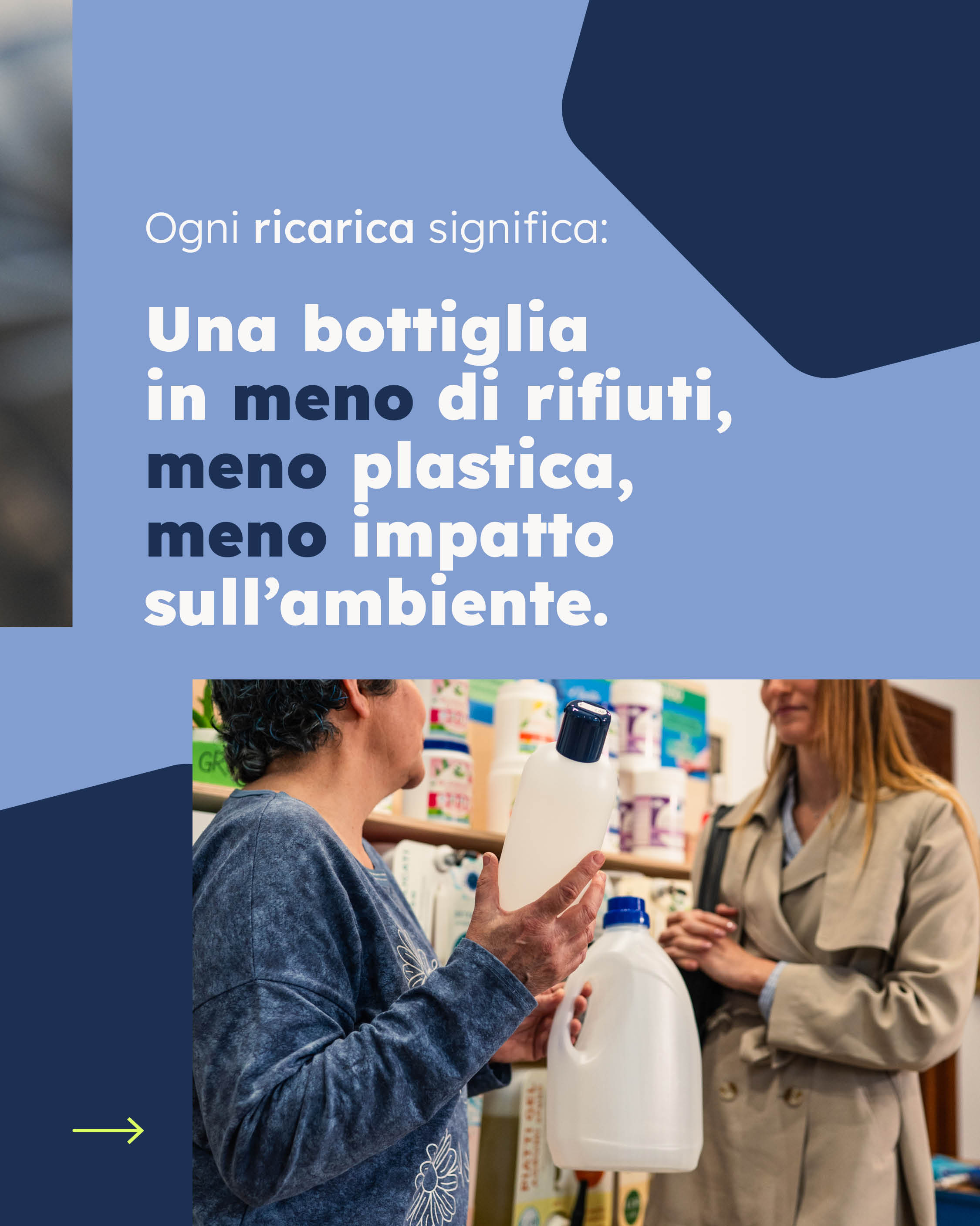 Riutilizzando la plastica (contenitori) si potrà così diminuire la quantità di rifiuti, ridurre l’inquinamento dei mari e delle falde acquifere e ridurre l’energia e le emissioni di Co2 normalmente impiegate dalle aziende per confezionare e trasportare i prodotti. Uno dei nostri obiettivi è quindi quello di riutilizzare gli involucri.